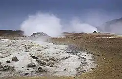 Landskab ved Námaskarð med en geotermisk kedel til højre