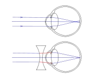 Øverst: Nærsynet øje som følge af at øjeæblet er "for langt". Nederst: Nærsynethed afhjælpes med en spredelinse.