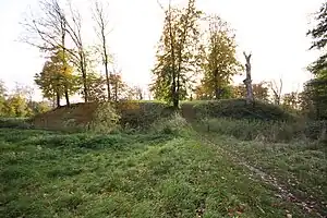 Dybe voldgrave og jordvolde omgav den cirka 55 gange 55 meter store slotsbanke.[2] Den næsten kvadratiske slotplads hævede sig ca. 20 meter over havet. Graven kunne passeres ad en bro fra nordøst.