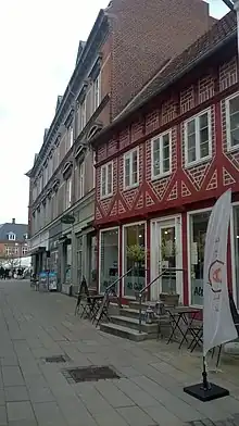 I Riddergade blev bindingsværksbygningen Apostelhuset bygget omkring år 1500,[45][46] og Ridderhuset i toetagers bindingsværk stod færdigt omkring 100 år senere.[47][48]