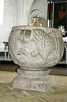 Den romanske granitfont har to par dobbeltløver på kummen (Mackeprang 265). Fonten blev udstillet på Danmarksudstillingen i London 1948, på en udstillingsrække i USA i 1960 og på Vikingeudstillingen i Paris, Berlin og København i 1992-93