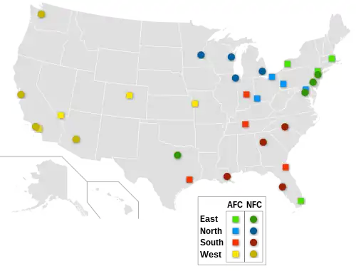 Som tidligere nævnt er der 32 hold i NFL; 16 hold fordelt på 4 divisioner i de to konferencer, AFC og NFC.