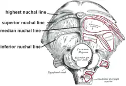 - Fra den ydre occipitale protuberans løber en kløft, miderste nakkelinje, ofte dårligt markeret, ned til foramen magnum, og ender med at hæfte til nakkebåndet.