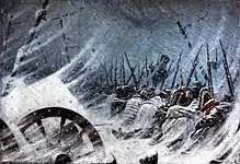 Kulden var så intens, at der ikke kunne bivuakeres. Sort uheld for dem, der faldt i søvn ved et lejrbål! Dertil kom, at uorden var ved at vinde indpas i garden. Man fandt hele tiden mænd, som overvundet af kulden var blevet tvunget til at give op og var faldet til jorden, for svage eller for følelsesløse til at stå. Man burde hjælpe dem på vej - hvilket praktisk talt betød at bære dem. De bad en om at lade dem være i fred. Der var bivuakkerende langs vejen - burde man tage dem med til et lejrbål? Så snart disse stakler faldt i søvn, var de døde. Hvis de modstod trangen til at sove, ville en anden forbipasserende hjælpe dem lidt længere, og dermed forlænge deres smerte et kort stykke tid, men ikke redde dem, for i denne tilstand er døsigheden fremkaldt af kulde uimodståelig stærk. Søvnen kommer uundgåeligt, og søvn er døden. Jeg forsøgte forgæves at redde en række af disse uheldige. De eneste ord, de udtalte, var at bede mig, for Guds skyld, om at gå væk og lade dem sove. Når man hørte dem, skulle man have troet, at søvn var deres redning. Uheldigvis var det staklens sidste ønske. Men i det mindste ophørte hans lidelser uden smerte. Taknemmelighed, og endda et smil, var præget på de misfarvede læber. Det, jeg har fortalt om virkningerne af den ekstreme kulde og af denne form for død ved forfrysninger, er baseret på, hvad jeg så ske med tusindvis af individer. Vejen var dækket af deres lig.[47]
