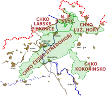 Mod vest glider nationalparken over i naturparken CHKO Labské pískovce som også ligger i Elbens Sandstensbjerge. Mod nordvest, på den tyske side, hænger de to fredninger sammen med Det Sachsiske Schweiz, som består af Nationalpark Sächsische Schweiz og det beskyttede landskab naturpark Sächsische Schweiz. Tilsammen udgør de fire fredninger et område på ca. 710 km² og omtales også som Det Bøhmisk-Sachsiske Schweiz.[2]