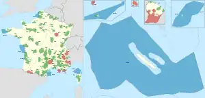 Franske nationalparker (røde), regionale parker (grønt) og marine parker (blå).