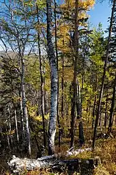 - Skovområder, kaldet tajga, som udgøres af tempereret nåleskov iblandet en del pionerarter af løvtræer