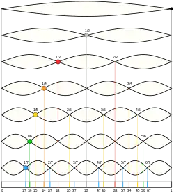 - 1: C (66 Hz). Grundtonen. Man kalder intervallet fra grundtonen til grundtonen en prim.