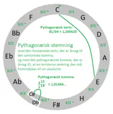 | Rækkefølge i 'kvintcirklen' (F = 1) | Tone | Frekvens, faktor i forhold til C |