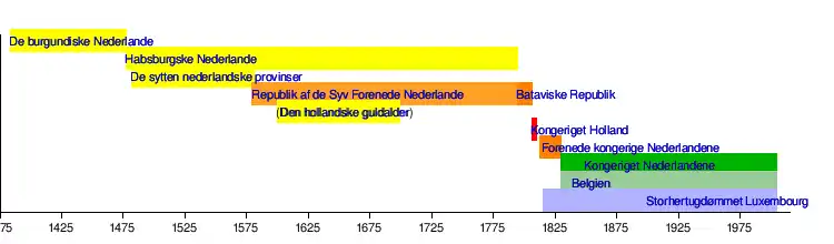 - De burgundiske Nederlande - 1384-1477 Svarede geografisk ca. til nutidens Holland, Luxembourg og størstedelen af Belgien.