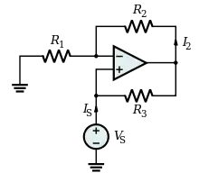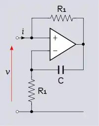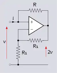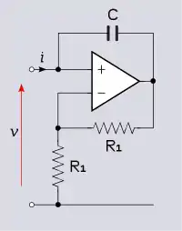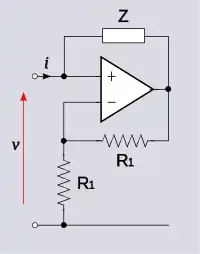 INIC er en ikke-inverterende forstærker (op-amp og spændingsdeler R1, R2 på figuren) med en resistor (R3) forbundet mellem dens output og input. Op-amp output spænding er