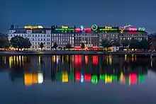 Der skulle gå to år mere, før den første neonreklame blev monteret i Danmark. Det var bare fire lange røde lodrette striber bestilt af Alexandra teateret i Nygade i København. De blev produceret i Tyskland og Frankrig, da der først blev produceret neonrør i Danmark i 1929. De nye rør blev hurtig meget populære pga. lang levetid og lavt strømforbrug. Året efter opførtes Carlsberg Obelisken, der med 198 rødtlysende 2 m lange neonrør kunne ses over hele byen. Den var 76 m over havet og kunne ses fra Fehmarn og blev brugt til at navigere efter af flytrafikken.