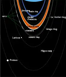 Neptun har et system af fem meget tynde, azurblå planetringe omkring sig,[15] men disse er meget mindre tydelige end dem omkring Saturn. Da ringene blev opdaget troede man kun der var tale om fragmenter af ringe, men dette blev modbevist af Voyager 2.