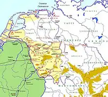 Fra 14 f.Kr. lod Drusus en række militærbaser opføre langs Rhinen, halvtreds ifølge Florus, og etablerede en alliance med Bataverne som forberedelse til militæraktion i Germania Libera.[3] Han har sandsynligvis haft syv legioner under sin kommando. I foråret 12 f.Kr. påbegyndte han en ekspeditionsstyrke, måske bestående af Legiones I Germanica og V Alaudae, med skib fra nærheden af det dagens Nijmegen, og tog anvendelse af en eller flere kanaler, han havde fået gravet til formålet.[3] Drusus sejlede til mundingen af Ems og trængte ind i chaukernes område i det nuværende Niedersachsen.[3] Chaukerne indgik en traktat, der anerkendte romersk overherredømme, og ville forblive Roms allierede i de kommende år.[3] Da de fortsatte op ad Ems, blev romerne angrebet af bruktererne i både.[3] Drusus' styrker besejrede bruktererne, men, da det nu var sent i felttogssæsonen, vendte de tilbage til deres vinterkvarter i Gallien og udnyttede deres nye alliance med Friserne til at navigere gennem de vanskelige forhold på Nordsøen.[3]