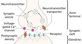 Den præsynaptiske neuron (øverst) frigiver neurotransmittere, der aktiverer receptorer på den postsynaptiske celle (nederst).