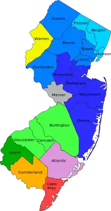 New Jersey er opdelt i 21 amter, af hvilke 13 stammer fra kolonitiden. New Jersey blev i 1692 helt opdelt i amter, og de nuværende amter blev dannet ved at opdele de eksisterende amter. Det nyeste amt er Union County fra 1857.
