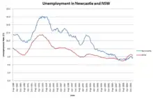 Recessionen i starten af 1990'erne ramte Newcastle og den tunge industri ekstra hårdt. City of Newcastle havde i februar 1993 en arbejdsløshedsprocent på 17% mod 12,1% i New South Wales og 11,9% i hele Australien.[24] Æraen med tung industri endte i 1999, da stålværket lukkede efter at været i drift i 84 år. 50.000 mennesker havde i denne periode været ansat på værket, mange i årtier.[25]