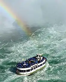 En række både, kaldt Maid of the Mist, sejler op til vandfaldene.