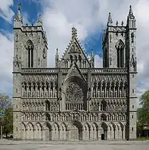 Det, som voldte restaureringsarkitekterne mest bryderi, var vestfronten. Én engelsk katedral har en vestfront som minder lidt om Trondheim, nemlig Lichfieldkatedralen. Den er en syntese mellem de franske totårnsfacader og den engelske skærmfacade. Nogle forskere mener, at Nidarosdomens vestfront kan have haft lighedspunkter med denne, men at det er to bygninger med uens byggehistorie, som snarere bør betragtes som paralleller.