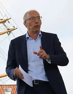 Niels Krause-Kjær som ordstyrer under debat på Folkemødet i Allinge havn. | |