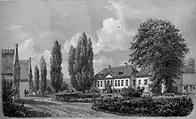 Nielstrup set fra nordøst i 1866. Tegning af Ferd. Richardt fra Danske Kirker, Slotte, Herregaarde og Mindesmærker.