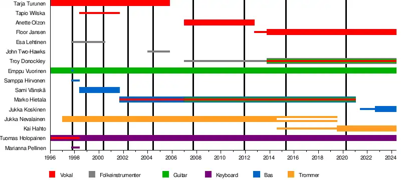 ![]() Nightwish efter en optræden i Toronto i i maj 2022; (fra venstre mod højre: Jukka Koskinen, Tuomas Holopainen, Floor Jansen, Troy Donockley, Kai Hahto, Emppu Vuorinen  | |