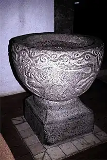Den romanske granitdøbefont har løver og bladværk i lavt relief.