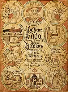Den mytologi, vi kender fra de islandske håndskrifter, bygger hovedsageligt på ældre fællesgermanske. Kun i Norden overlevede traditionen længe nok til, at nogle af myterne blev nedskrevet i tekster og blev overleveret til eftertiden. Især den islandske digter Snorri Sturluson, der i 1200-tallet nedskrev fortidens mundtligt overleverede gude- og heltesagn i den islandske Edda[44] . Fra især islandske kilder har vi derfor adgang til et omfattende mytologisk materiale, der kan suppleres med andre levn.
