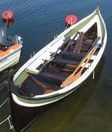 - Den har to rum, framrum og agterrum, i tillegg til framskott og etterskott. Kan ros med to par årer.