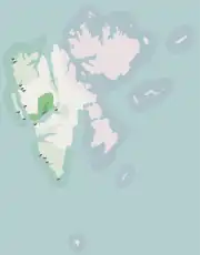 ![]() Nordre Isfjorden nationalpark i Svalbard. Andre nationalparker i grøn; naturreservater i lilla. Fuglereservater er markeret med fugleikoner. | |