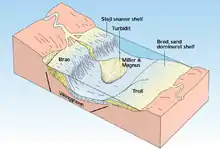 I 1971 fulgte det måske mest skelsættende fund, nemlig Brent-feltet i East Shetland-bassinet nordøst for Shetlandsøerne. Hidtil havde man ikke formodet, der kunne være reservoirer dybere end skrivekridtet, men i denne boring fandt man en serie på mere end 200 m sandsten fra Jura, som var fyldt med olie. I løbet af få år blev der fundet en række felter i denne reservoirtype, således de norske felter Statfjord, Oseberg, Snorre og Gullfaks og de engelske Brent, Beryl, Cormorant, Lyell og Ninian. Også de danske felter Harald og Lulita er af denne type.[8] Brent-råolien er af en forholdsvis let, svovlfattig type, som er nem at forarbejde, og olie fra Brent og lignende felter er blevet en international prisstandard ved oliehandel, såkaldt Brent Crude.[17]