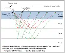 Til havs udføres en seismisk undersøgelse fra et skib, som sejler i et net af parallelle linjer, typisk i to retninger, så man få krydspunkter, hvor seismiske data kan sammenlignes. Lyden udsendes fra en lydkilde lige bag skibet, og de reflekterede bølger opfanges af en såkaldt streamer, et system af hydrofoner, fintfølende mikrofoner som slæbes efter skibet. Frem til slutningen af 1960-erne brugte man dynamit som lydkilde, hvilket var effektivt, men ikke helt ufarligt og desuden skadeligt for fiskebestandene. Man gik derfor over til at bruge airguns, hvor komprimeret luft udløser en lydbølge. Efterhånden udviklede man systemer med flere airguns, hvorved lydbølgens energi kan rettes nedad, så gennemtrængningen gennem lagene forbedres. I begyndelsen var streamerne omkring 1 km lange, men nu bruges op til 12 km lange streamere, hvorved datakvaliteten forbedres.[29]