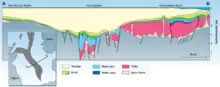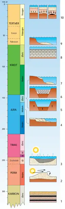 Den stratigrafiske søjle til venstre viser ti vigtige trin i dannelsen af Nordsøolien. Nederst (og tidligst) blev der i Karbon-periodens udstrakte sumpskove dannet tykke kullag (1). Kullene blev i den efterfølgende varme og tørre Perm-periode dækket med permeabel ørkensand (2). Senere, i Zechstein, oversvømmede havet ørkenen, og det tørre og varme klima førte til at der udfældedes tykke, impermeable saltlag på bunden af havet (3), oven på ørkensandet. Herved var de geologiske forudsætninger til stede for dannelsen af de karbone gasfelter i den sydlige Nordsø.[8]