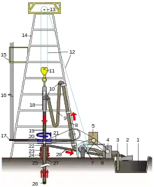 Den grundlæggende boreteknik har ikke ændret sig synderligt siden 1960-erne, se tegning til venstre. Man borer vha. et boretårn (14), hvor borestammen (16 og 25) er ophængt i en taljeblok (11), som vha. et trissekabel (12) kan hæves og sænkes. Borestammen bringes til at rotere på roterbordet (20), hvorved borekronen (26) kan skære sig ned gennem lagene. Det friskårne materiale, kaldet cuttings, løftes op til overfladen vha. boremudder. Dette er en tyk specialblandet væske med høj densitet, som vha. en pumpe (4) føres fra et reservoir (1) gennem slanger (3, 6, 8, 9, 10) og ned gennem den hule borestamme. Nede ved borekronen spuler boremudderet cuttings med sig op langs ydersiden af borestammen (28) og op til et filter (2), hvor cuttings skilles fra mudderet, som så genanvendes. Når taljeblokken er nået ned til roterbordet, skilles borestammen ad og en ny længde borerør tages fra et depot (16) og skrues på øverst. Hvis man rammer lag med forhøjet poretryk, fx olie eller gas, men også porevand, kan væsken skyde op gennem borestammen og fremkalde et blowout, hvor olie eller gas ukontrolleret står som et springvand ud af boreriggen, med fare for forurening, brand, eksplosion og tab af materiel og menneskeliv. Boreriggen er derfor forsynet med en blowout preventer (23 og 24), en ventil som i givet fald kan lukke af for strømmen. I april 1977 skete der et sådant blowout på Ekofisk Bravo-platformen, hvorved i størrelsesordenen 100.000 tønder olie flød ud i havet. Uheldet skyldtes en defekt ventil.[30]