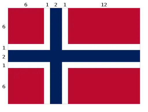 Det norske flag indeholder et mørkeblåt kors med hvide kanter på rød bund. Korset har midten forskudt mod stangen.