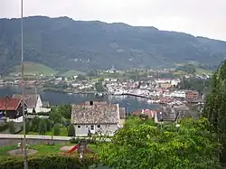 Norheimsund ved Hardangerfjorden, med Folgefonna i baggrunden.
