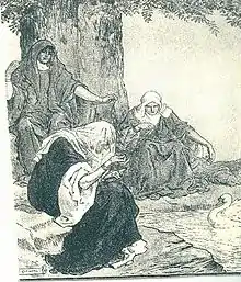 - Der staar en skøn Sal under Asken ved Brønden; fra denne Sal kommer tre Møer, der hedder Urd, Verdandi og Skuld. De fastsætter Menneskenes Levealder. Vi kalder dem Norner. Men der er flere Norner, de, som kommer til hvert Barn, der fødes, for at vedtage dets Alder, og de er af Gudeæt; andre er af Alfeæt, en tredje Slags er af Dværgeæt, som det hedder her[29]: