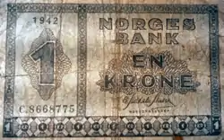 ![]() 1-kroneseddel udgivet under 2. verdenskrig pga. manglende råvarer til at lave mønter.  | |