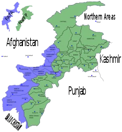 Kort som viser Khyber Pakhtunkhwa (grøn) og de Føderalt Administrerede stammeområder' (Engelsk:Federally Administered Tribal Areas (FATA)) (blå)