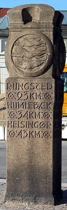 | Nørreport[2] | 55°41′1.66″N 12°34′17.51″Ø | Frederikssund 41 km Frederiksværk over Frederikssund 58 km Farum 22 km Slangerup 36 km Frederikssund 44 km Hillerød ad Frederiksborgvejen og Lynge Kro 41 km | 1925 |