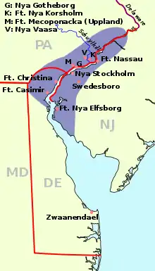 Efter at have sejlet over Atlanterhavet købte ekspeditionen i 1638 land fra indianerne ved Delaware-floden, som blev kaldt for Nye Sverige eller Nova Suecia. Ekspeditionen var så svagt bemandet at samarbejdet med indianerne blev livsnødvendig. Der blev bygget et fort ved Minquas Kill, hvilket var til stor irritation for de nederlandske nabokolonister. Dette fort blev kaldt Fort Christina efter den daværende svenske dronning.
