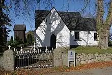 På kirkegården er der en klokkestabel med sadeltag. Den skal efter sagnet være opført af en jomfru, der boede her nær Gudholm og hvis ligsten endnu findes på kirkegården.[1] Menigheden hører under den lutherske nordtyske kirke.