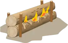 Der placeres tykke stokke i hver ende for at holde afstand. Bålet startes med tynde og brændbart materiale placeret i hullet.