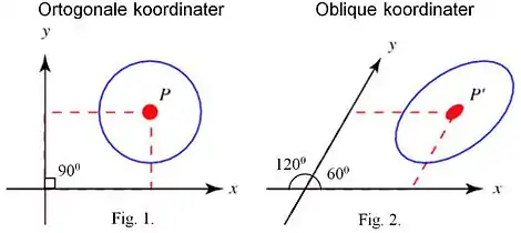 Hvis den kartesianske ligning for en kurve i et ortogonalt (retvinklet) koordinatsystem som vist i Fig. 1. anvendes på et skråt (spids- el. stumpvinklet) koordinatsystem med oblique koordinater som vist i Fig. 2., vil resultatet blive en forvrænget kurve. For eksempel vil en cirkel som vist i Fig. 1. blive omdannet til en ellipse som vist i Fig. 2.