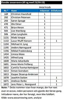 Til og med udgangen af oktober 2023 har i alt 22 danskere (17 mænd og 5 kvinder) roet over et ocean. 4 har gjort det mere end én gang.[11] Lasse Wulff Hansen er den første dansker til at ro to oceaner.