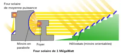 Man benytter sig af, at solstrålerne kan koncentreres ved hjælp af spejle. De bliver først opfanget af en række bevægelige spejle, som står på en skråning, og derfra bliver de sendt videre til en anden serie af spejle, som er anbragt på en parabolskærm. Derfra sendes de ind mod en rund skive på toppen af tårnet i midten. Denne skive er knap 40 cm i diameter, og dér koncentreres energien, så den svarer til ”10.000 sole”.