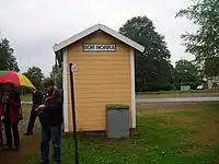 - Trinbræt lige før den lille landsby, Gimarp. Søen ved trinbrættet hedder Finnsjön, og der har tidligere græsset husdyr.