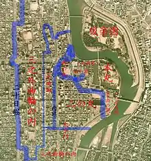Slottet blev bygget i en bugtning af floden Asagawa (旭川; den mørkeblå bugtning).