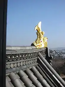 I dag er kun nogle få dele af Okayama-slottets tag (herunder de fiskeformede Shachihoko) forgyldt, men før slaget ved Sekigahara havde hovedbygningen også forgyldte tagfliser, der gav det kælenavnet "Gyldne Krage Slot" (金 烏 城 Kin U-jou).