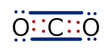 Bindingen i kuldioxid: Det centrale carbonatom er omgivet af otte elektroner som defineret i oktetreglen, og giver således et stabilt molekyle.